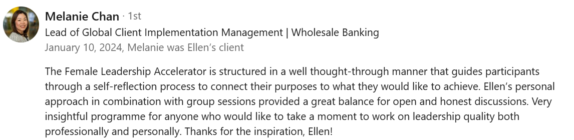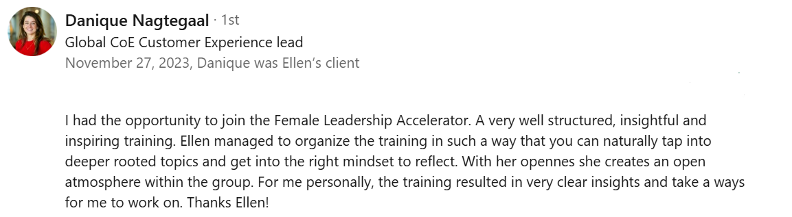 Next to that I am a certified executive coach, host podcasts around personal growth and with the Female Leadership Accelerator launched my 3rd online training program in September 2023.